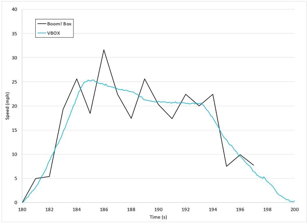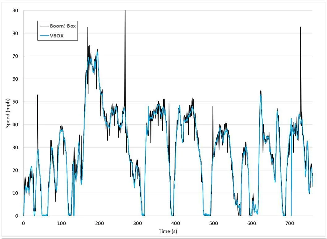 If data is available, the interrogation will yield files in .GPX format, which can be imported into Google Earth or Garmin’s Base Camp. I compared data from several runs to data acquired with a Racelogic’s Video VBOX and found good general alignment. However, upon closer examination the Boom! Box data often “saw-toothed” around the actual speed. As such, caution should be used when analyzing the data. At this point, it seems using a six-point moving average filtering routine improves results, yielding better alignment with the true speed curve.