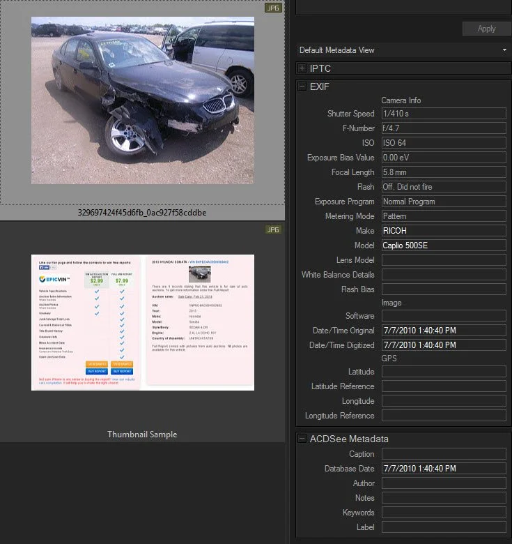 The lot of photographs generally includes four corner shots, some interior shots, an odometer shot, and one or two shots devoted to the damage. The image size is minimal (100 KB or so) but the angles are good, and they’re generally taken outdoors, so the lighting is good as well. Moreover, you are able to download the original JPEG image, and that includes EXIF data (shown below). This often tells you when the photograph was taken, what camera was used, and the camera settings. This is great info if you’re interesting in performing a crush analysis.