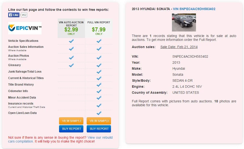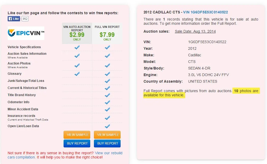 Once you enter the VIN, you’ll be brought to a page that looks like the one shown below. In this case, a thumbnail image of the subject vehicle popped up and there is some text that says, “10 photos are available for this vehicle.” Jackpot. Now, you can just click on the blue “Buy Report” button. The $2.99 report comes with all available photographs, so I usually go that route unless I’m more concerned with the vehicle’s history. The report can also be downloaded in PDF format.
