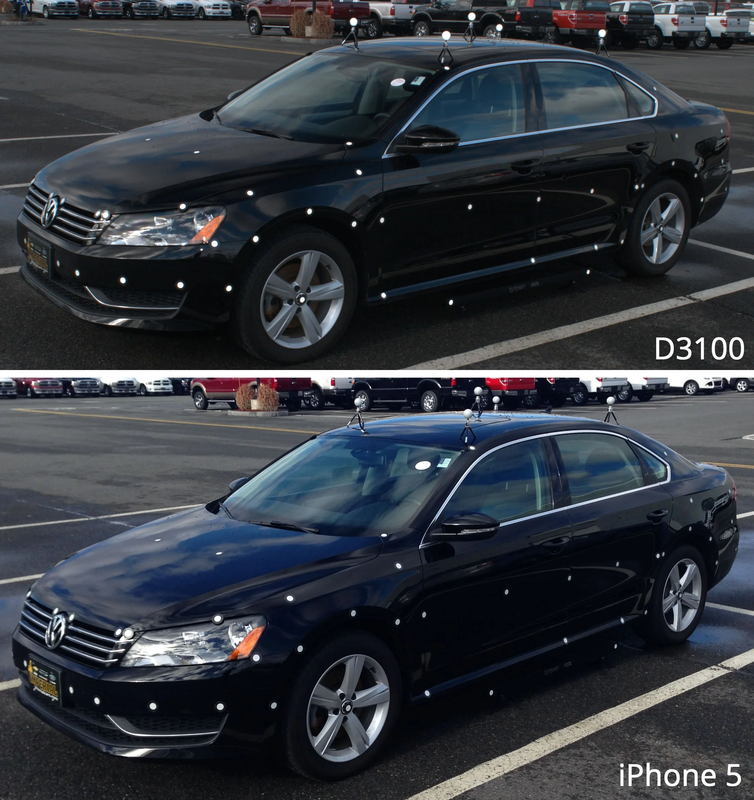 If you’re reading this article, chances are you know something about photogrammetry… the science of obtaining measurements from photographs. Well, the iPhone 5 has an 8 megapixel camera with a 1/3.2” sensor (measuring 4.54 x 3.42mm, or 0.18 x 0.13 inches). When compared to a basic Nikon DSLR, like the D3100, which is a 14.2 megapixel camera with a sensor measuring 15.4 x 23.1mm, it becomes clear the iPhone 5 doesn’t compare with most photogrammetry user’s equipment. But, can the iPhone’s baby sensor create photographs capable of producing reliable measurements? To find out, we created four models of the same vehicle, a 2012 Volkswagen Passat: