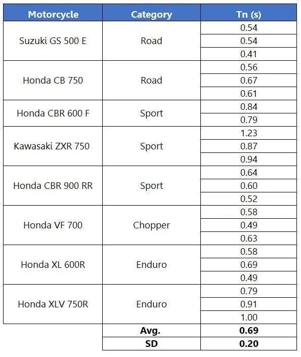 23 tests were performed by a single rider with seven years of experience, piloting eight different motorcycles. The development of the braking maneuver was documented with an XL Meter running at 200 Hz and the time to reach steady-state braking was reported. The average duration was 0.69 seconds and the standard deviation was 0.20 s. A summary of all the tests is included below: