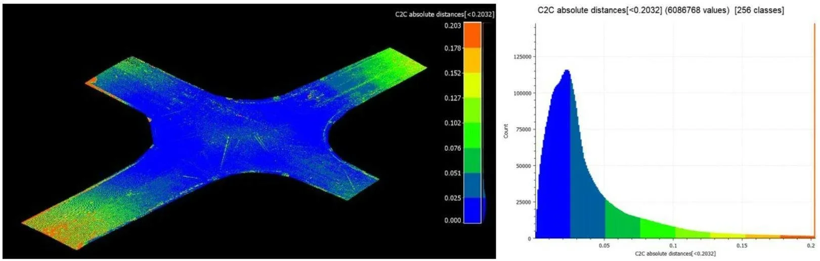 Gary Osterholt, Lindsay Oleson, Garrick Mitchell and Christopher Wood compared the accuracy of point clouds generated via drone/Pix4Dmapper to those generated with FAROs (S350 and X330), putting a particular eye on the effect of using GCPs, which were acquired using the Reach RS2+. Five sites with varying features and topography were measured, with 10 GCPs placed at 60-foot intervals. The resultant roadway data (environmental data was excluded) were then brought into CloudCompare for comparison. Figure 5 from the paper is shown below, displaying the absolute distance between the Pix4D and FARO clouds. If you’d like to read the whole paper, please refer to the latest ARJ (the full citation is below my signature).