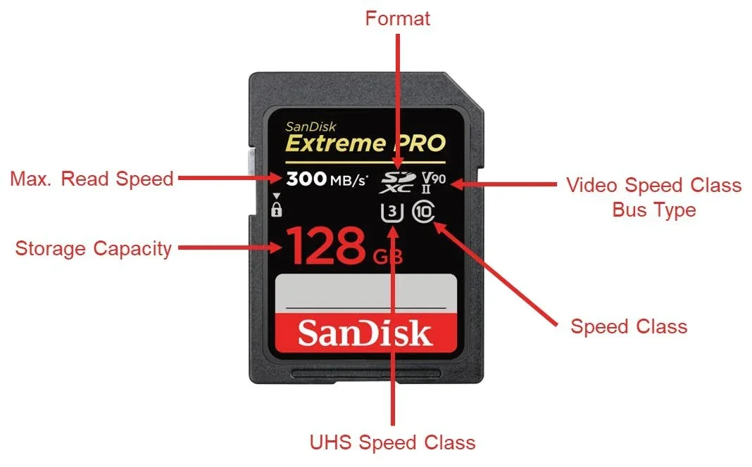 Video Speed Class | Bus Type: The minimum sequential writing speed of the card. V90, for instance, means the card can sustain video recordings of 90 MB/s until the card is full. V30 would be 30 MB/s, etc. For many modern cameras, you need V90 to access all video recording formats and frame rates. The "II" below V90 means UHS-II (see below).