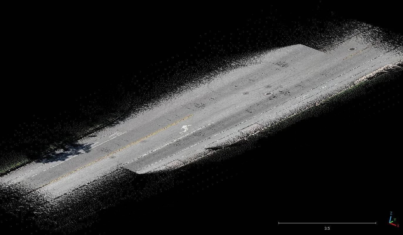 The GoPro was set to capture at 5.3K / 24 fps / linear mode with no stabilization, and I drove between 30 and 35 mph through a section of two-laner with a center median, heading both northbound and southbound. Every frame was extracted using FFmeg as a JPG (to save on computational resources), and each pass was processed individually with RealityCapture [RC].