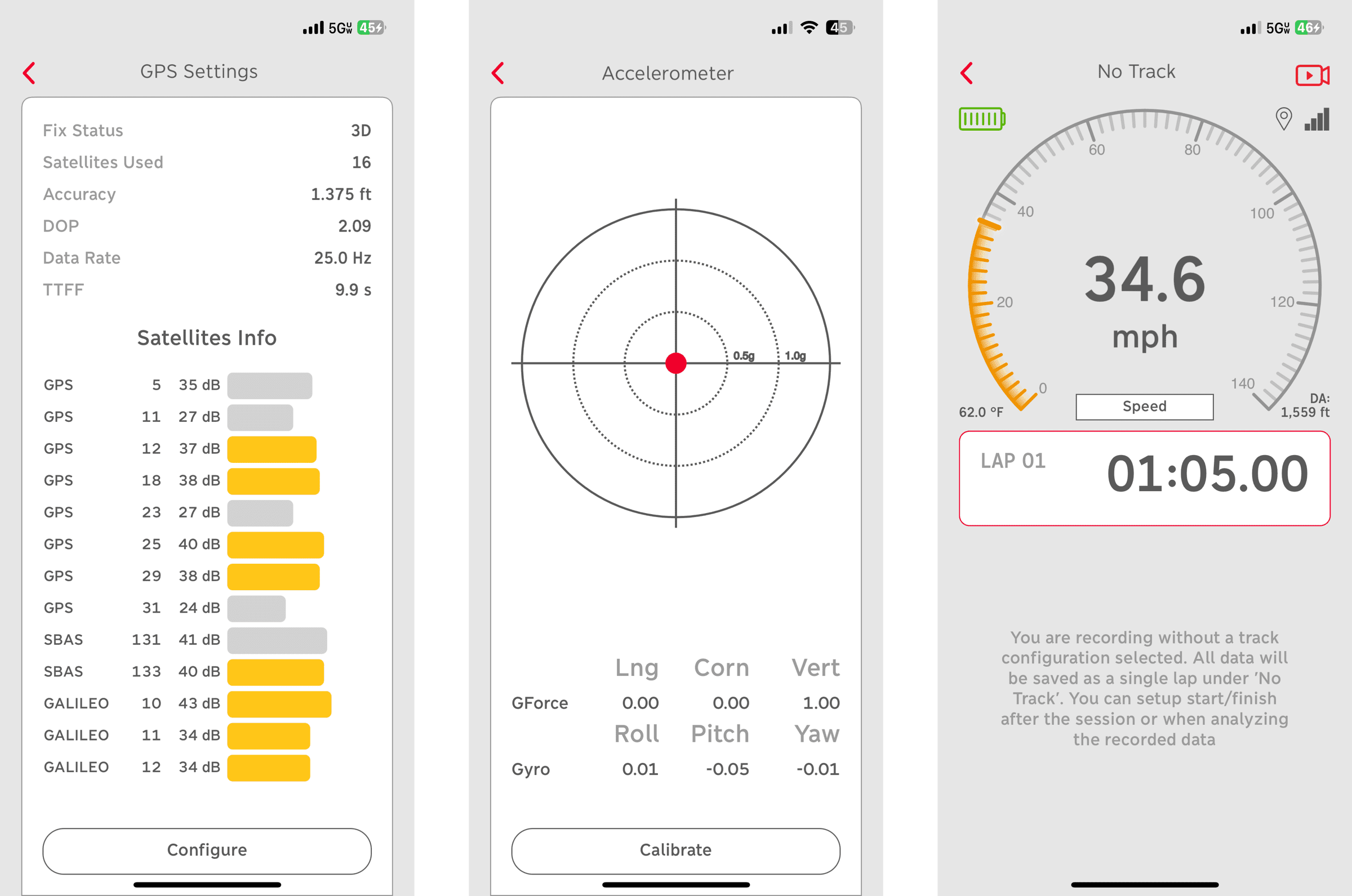 Left: GPS status info. Middle: Real time display of triaxial accelerations. Right: Heads-up display during testing.