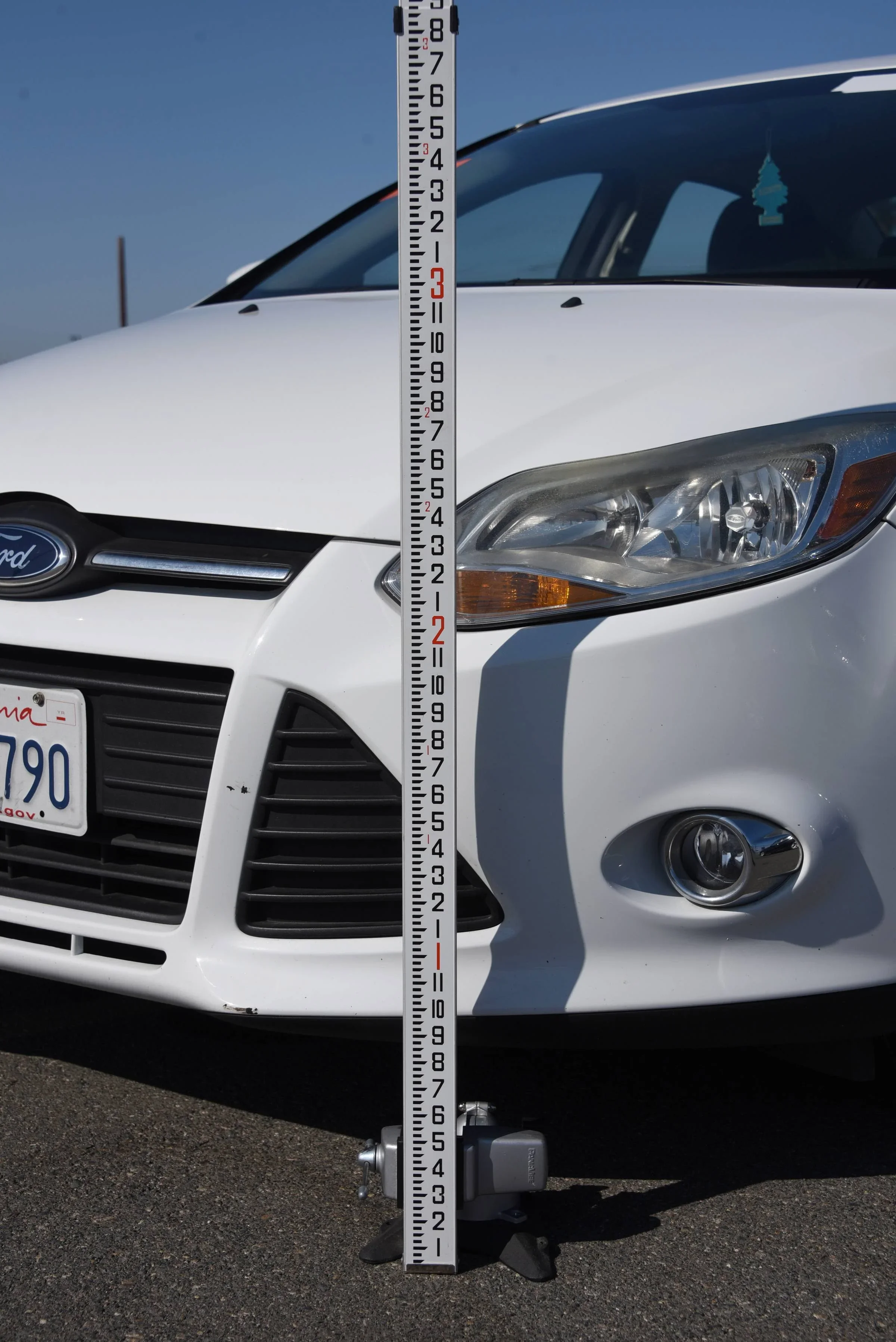 A survey rod held firm by a weighted vice. It’s professional looking, doesn’t get blown about by the wind, and it can be moved around the vehicle easily. Thanks to Eric Deyerl for introducing me to this setup. I’ve been using it at vehicle inspections for over a decade and appreciate it every time.