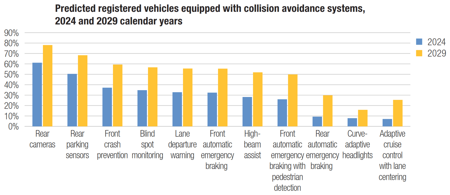 The lag between availability and adoption is always bigger than I think, especially with big purchases like vehicles. Not everyone is in a position to trade their trusty 2010 Camry for a 2025 model equipped with all the bells and whistles. Still, check out all the vehicles predicted to be equipped with specific collision avoidance systems by 2029!