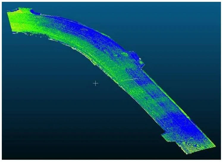Figure 16 from the SAE Paper showing ALS point cloud data from the suburban site compared to the TLS data. Blue points represent distances of 0.0 to 1.2 inches.