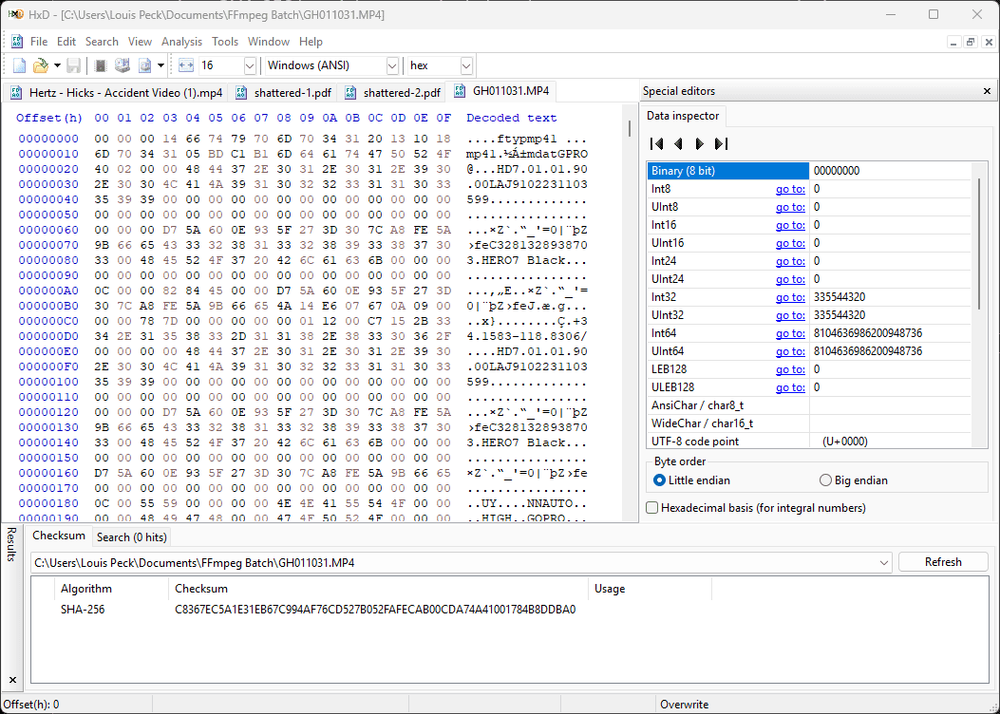 So, how do you generate a hash value? Amped FIVE and Axon Investigate have the algorithms built in, as does the freeware, HxD. For the latter, drop the file in, click on Analysis, Checksums, select your weapon of choice, and the hash value will be displayed.
