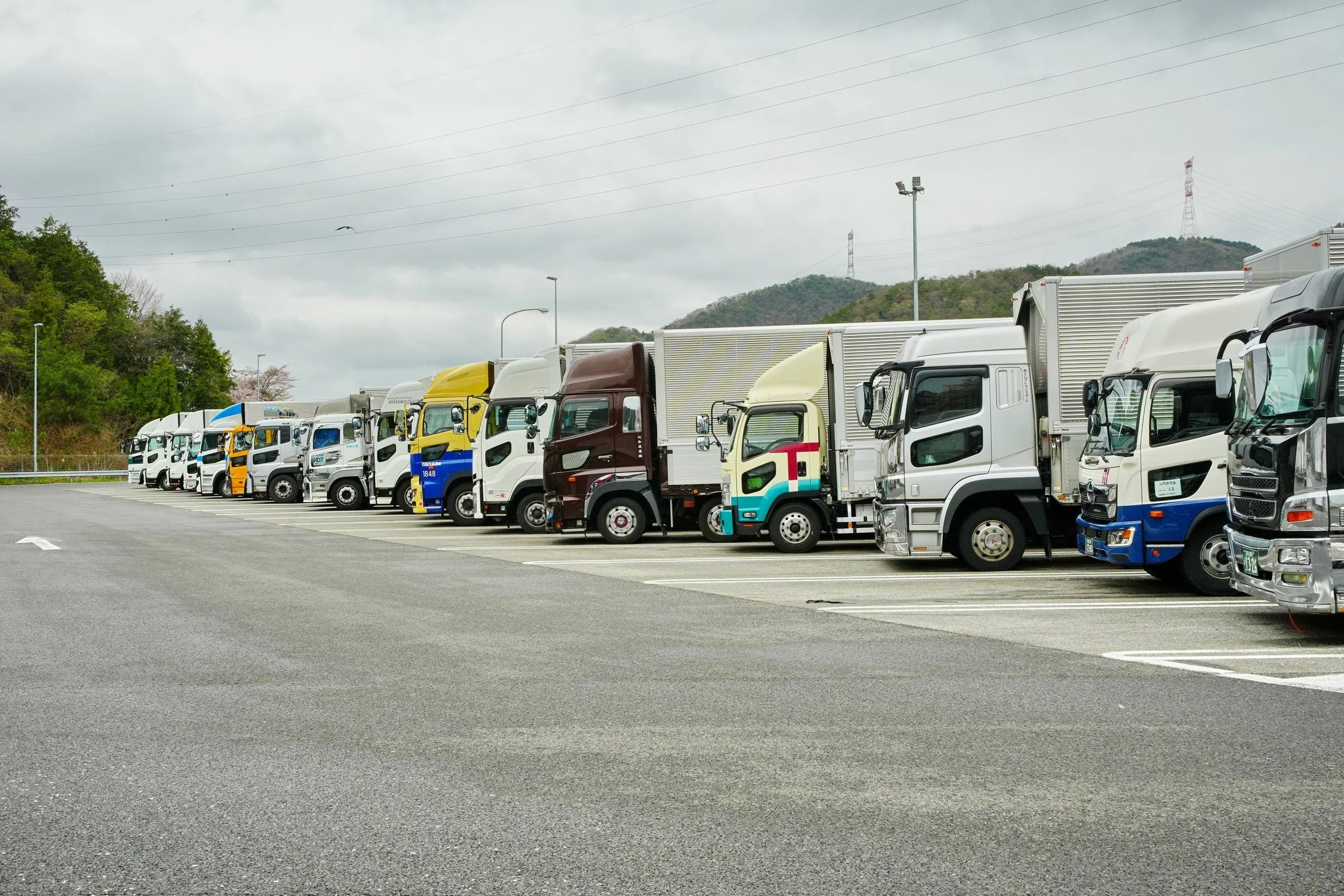 Image 1: Lineup of commercial trucks at rest area.